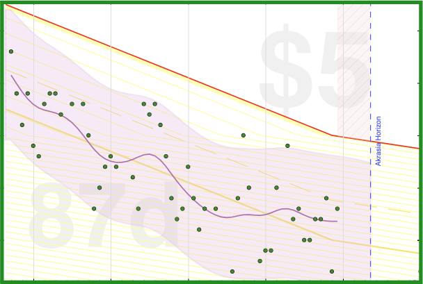 Their datapoints bounce around a lot but the smoothed version shows that they're hewing to the weight-loss rate they committed to, and staying far enough below that bright red line that even random up-days won't derail them.